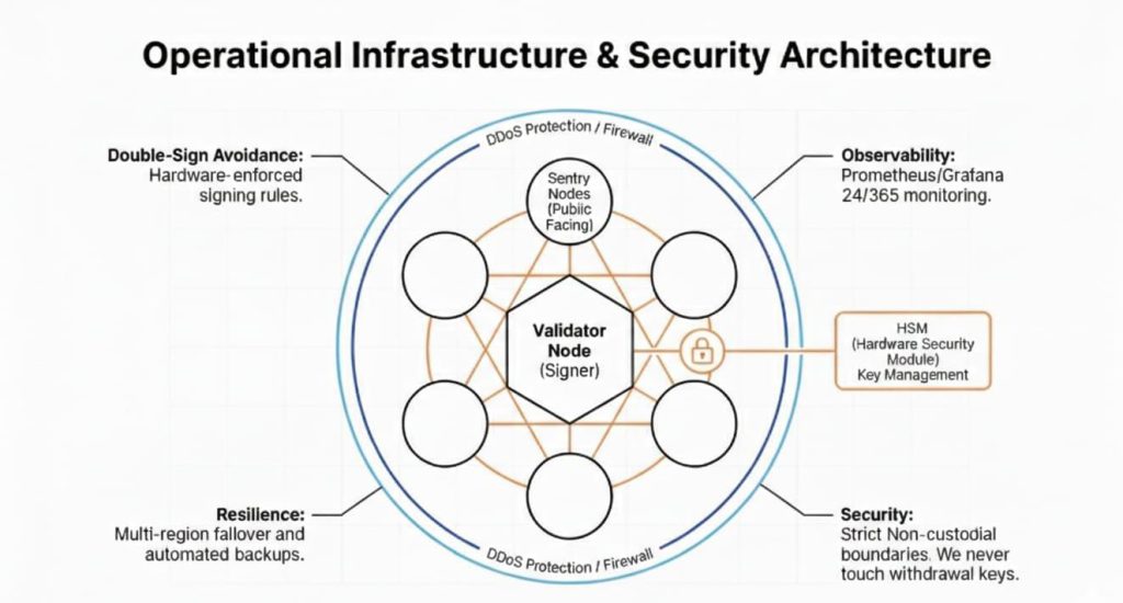 Our production-ready Operational Infrastructure & Security Architecture clearly highlights the “defense-in-depth” layers that protect our delegators’ assets.