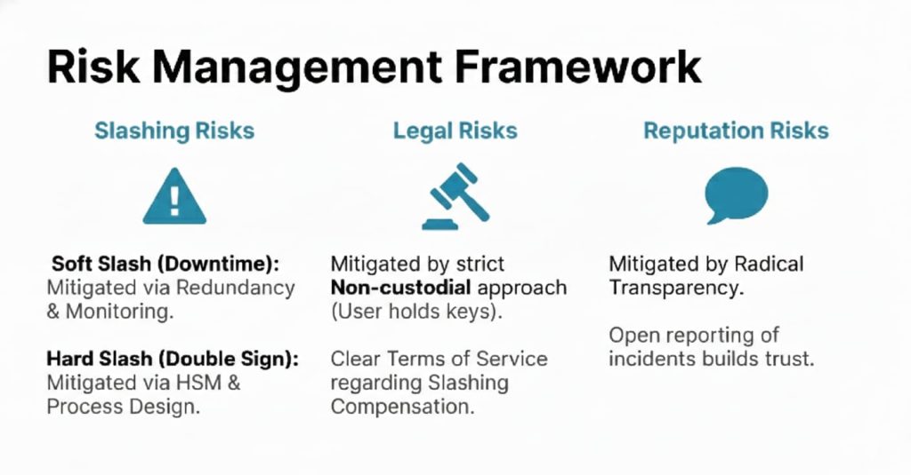 The provided Risk Management Framework for EAZE Validator Japan outlines a comprehensive strategy for maintaining the integrity and reliability of their staking operations through three core pillars: Slashing Risks, Legal Risks, and Reputation Risks. To address technical vulnerabilities, the framework distinguishes between soft slashing caused by downtime and hard slashing resulting from double signing, utilizing high-level redundancy, constant monitoring, and Hardware Security Modules (HSM) to safeguard delegator assets. Legal compliance is centered on a strictly non-custodial architecture where users maintain control of their private keys, supported by clear contractual terms regarding compensation protocols. Furthermore, the validator reinforces institutional trust through a commitment to radical transparency, ensuring that all operational incidents are reported openly to the community to maintain a strong and dependable reputation within the Japanese blockchain ecosystem.